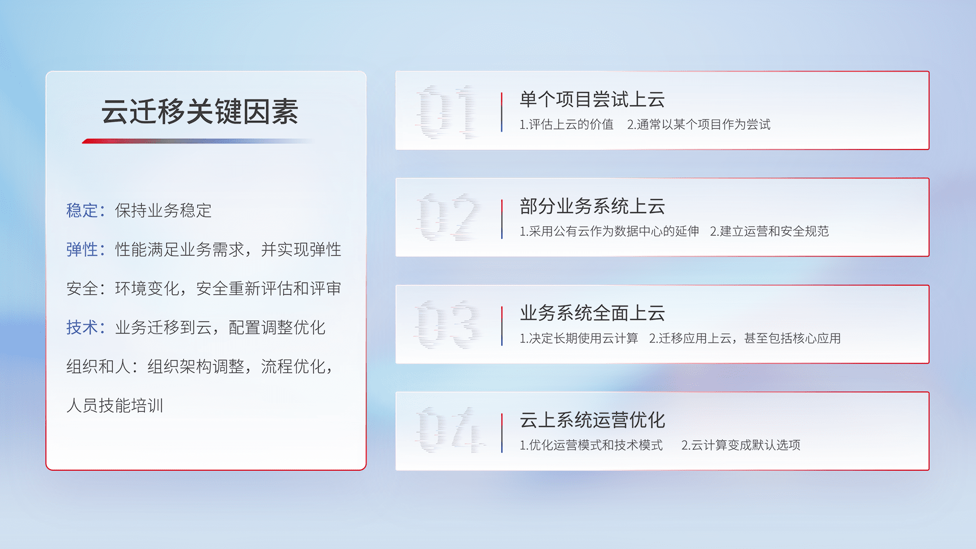 结合实际业务,,,,从规划设计、、、云平台选型、、、云原生改造、、、数据迁移、、集成交付,,迁移全过程为客户识别最佳上云路径,,,做好风险识别管理,,设计网络架构、、、、身份权限、、、、安全审计合规、、、、操作审计、、、日志审计、、监控告警策略、、、、多站点容灾设计等,,,对云上基础设施进行整体规划,,,,提升IT治理水平,,,以满足弹性、、高可用、、高性能的需求。。