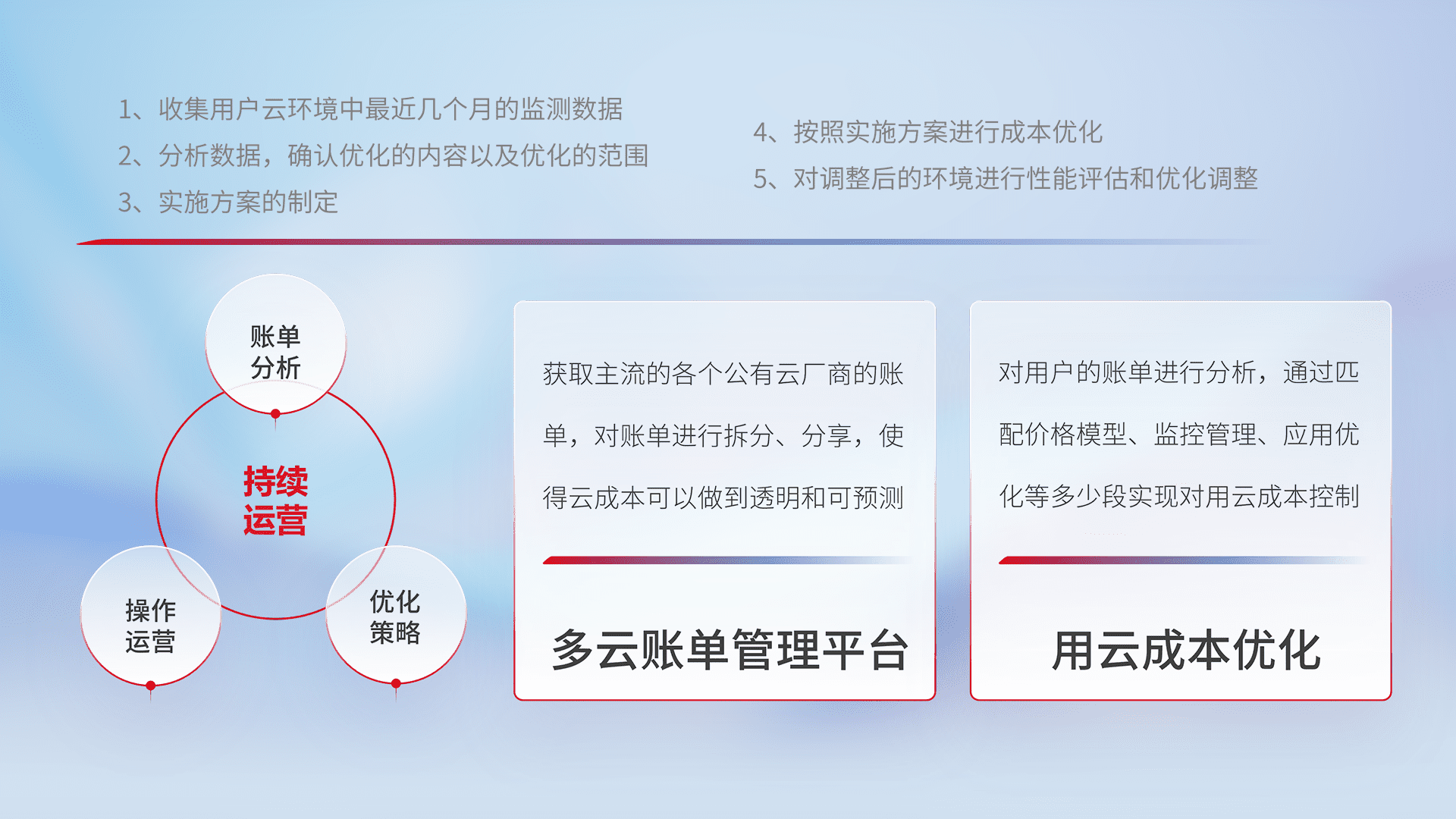 通过多云纳管,,,以统一的资源数据模型把客户的云资源进行抽象和封装,,,进而实现对多云资源的统一操作,,,,保障云资源管理的可靠性、、、、稳定性与可用性。。。。量身定制化运维内容,,,,配置、、、、开发运维、、、、补丁管理、、、备份、、、监控、、认证和访问管理、、审计和日常巡检等,,保障在用云过程中的可靠度,,稳定度以及高可用率。。。